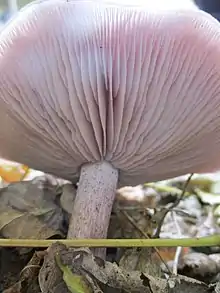 Adhering; attached to the stipe throughout its width, esp. of lamellae or tubes. Compare with free.[10]