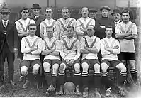 The 1913–14 season saw a club record attendance of 10,736 for an FA Cup second round match against Preston North End on 31 January 1914.[5] However, the following season they finished bottom of the league and had to apply for re-election. This was curtailed when the start of World War I meant the Football League closed down. Glossop were then re-formed toward the end of the war by Oswald Partington, but failed to be re-elected back into the Football League. Glossop then joined the Lancashire Combination, playing just one season, 1919–20.[3][4] Northern Nomads ground-shared with Glossop for several years during this time. The club then dropped out of the Lancashire Combination and into the Manchester League. In the 1920s and 1930s they won the Gilcryst Cup three times and were crowned Manchester League champions in 1927–28. They won the Gilcryst Cup for a fourth time in 1947–48.[3][4]