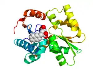 Crystallographic structure of glutamate racemase from the bacteria S. pyogenes (rainbow colored cartoon, N-terminus = blue, C-terminus = red) complexed with the inhibitor gamma-2-naphthylmethyl-D-glutamate (magenta spheres; carbon = white, oxygen = red, nitrogen = blue) that occupies the active site.[11]