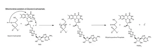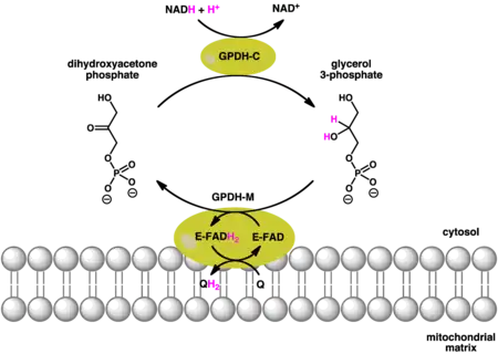 ![]() Coupled reactions catalyzed by the cytosolic (GPDH-C) and mitochondrial (GPDH-M) forms of glycerol 3-phosphate dehydrogenase.[7] GPDH-C and GPDH-M use NADH and quinol (QH) as an electron donors respectively. GPDH-M in addition uses FAD as a co-factor. |