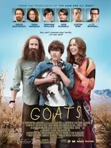 Goats is a 2012 comedy-drama film directed by Christopher Neil and written by Mark Poirier based on his 2000 novel Goats. The film stars David Duchovny, Vera Farmiga, Graham Phillips, Keri Russell, Justin Kirk, and Ty Burrell. The film premiered at the Sundance Film Festival on January 24, 2012, and was given a limited release in the United States on August 10, 2012, by Image Entertainment.