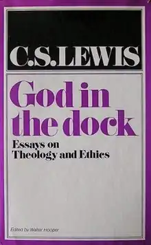 God in the Dock is a collection of previously unpublished essays and speeches from C. S. Lewis, collected from many sources after his death. Its title implies "God on Trial"[lower-alpha 1] and the title is based on an analogy[1] made by Lewis suggesting that modern human beings, rather than seeing themselves as standing before God in judgement, prefer to place God on trial while acting as his judge.