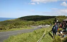 An historic location on the TT race course after the climb up from Ramsey demarking the end of the tree-line and start of the Mountain section with a height of 550 feet (168 metres) above sea level,[3] the Gooseneck is a popular vantage point for the spectators and a traditional signalling point for TT riders' intermediate race timings from their own back-up crews, one of a number of points around the course where the race machines slow enough to get a good look at the signal boards on the exit.[4] For the same reason, the location has always been popular with professional photographers and film-crews.