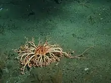 It feeds by perching in an elevated position and extending its arms in a net-like fashion perpendicular to the current. The branches and branchlets twist and coil, making it resemble an animated bush.[6] It ensnares small crustaceans such as the northern krill (Meganyctiphanes norvegica), copepods, chaetognaths, jellyfish, and detritus that come within reach. Trapped prey becomes the centre of a "knot" where it is immobilised by the secretion of mucus. Further coiling of the branches brings the food to the mouth which is on the underside of the central disc. Here, the branchlets are passed through a comb-like structure which removes the food particles. There is no anus and any undigested fragments are expelled through the mouth.[2][4][6]