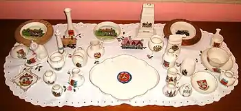 Goss crested china is typically in the form of small white glazed porcelain models, made from 1858 to 1939, carrying the coat of arms of the place where they were sold as a souvenir, thus being a form of model heraldic china.