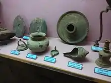 The museum has both indoor and outdoor exhibits of up to 2000 objects.[5] Some of the indoor exhibits include epoch artefacts like megalithic sculptures, carvings, Stone Age inscriptions, musical instruments, tools, currencies and Chola-era coins, paintings,[6] photographs, rare documents, palm-leaf manuscripts, fossils, tribal life of pachamalai and kohli hills, weapons and cannonballs used by Hyder Ali, early day snaps from BHEL company, Srirangam temple model, Rockfort temple model and philatelic materials.[4]