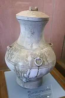 During the Han dynasty, the power a government official exercised was determined by his annual salary-rank, measured in grain units known as dan, shi or shih (石, a unit of volume, approximately 35 litres (0.99 US bsh)). However, approximately half an official's salary in grain was made in payments of cash coins,[1] the standard of which, after 119 BC, was the wushu (五銖) coin measuring 3.2 g (0.11 oz).[2] The other half of an official's salary consisted of unhusked grain and husked grain measured in hu (觳, approximately 20 L / 676 oz); since one hu of unhusked grain was equal to 100 coins and one hu of husked grain was equal to 160 coins, the conversion ratio for unhusked grain to husked grain was 10 to 6 (see table below).[3] The most senior officials in central government earned a 10,000-dan salary. The officials who oversaw nine specialized ministries each earned the Fully 2,000-dan rank, while the magistrate of a county earned a 600-dan rank.[4] Occasionally, emperors bestowed luxurious gifts of wine, foodstuffs, and silk clothes upon high officials. These gifts, in some generous cases, could equal as much as half the value of the officials' standard annual salary.[5] Aged officials were often retired from service and given a pension.[6] Below is a table outlining salaries measured in coin cash, unhusked grain, and husked grain for the highest to lowest-paid officials in Han officialdom:[7]