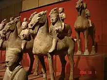 The Minister Coachman (Taipu 太僕), also known as the Grand Coachman, was responsible for the maintenance of imperial stables, horses, carriages and coachhouses for the emperor and his palace attendants, and for the supply of horses for the armed forces.[87] His latter duty entailed the supervising of large breeding grounds of frontier pastures, tended by tens of thousands of government slaves.[88] By the reign of Emperor Wu of Han (r. 141–87 BC) these contained 300,000 warhorses intended for use in campaigns against the nomadic Xiongnu Confederation.[89] Some of the Minister Coachman's subordinates managed stables outside the capital city. These stables housed Ferghana horses that were imported or gathered as tribute from Central Asian countries.[90]