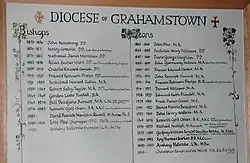 The Diocese of Grahamstown was founded in 1853 with John Armstrong as the first bishop. During the oversight of Bishop Nathaniel Merriman when Frederick Henry Williams was dean, conflict arose between the two regarding the status of the Church of the Province of Southern Africa versus the Church of England and the validity of the appointments of bishops. Dean Williams then excluded Bishop Merriman from his cathedral. This action resulted in many court cases which Williams won.