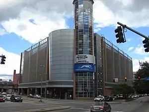 Main entrance to the bus station and tall glass tower at the corner of Liberty Avenue and 11th Street