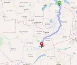 The Great North Road of Zambia initially started further south of Lusaka, at Livingstone (which was the capital of the nation before 1935) and then headed north-east from there, past Choma and Kafue, to reach Lusaka.[4][5] Then, after the capital of the nation became Lusaka in 1935, Lusaka was regarded as the southern terminus of the Great North Road and the road connecting Lusaka to Livingstone (currently designated as the T1 road) was no-longer regarded as part of the route.[6]