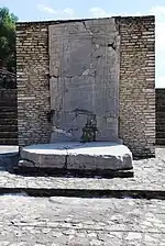 Four altars were excavated from the final construction phase of the Courtyard of Altars.[44] Three of them were decorated with low relief sculpture,[44] which has allowed for the recovery of some of the fragments of Cholula's history.[46] The centre section of each altar was left blank but may originally have been painted with religious designs.[44]