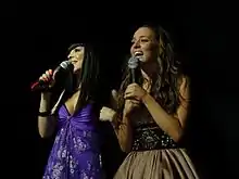 The stage show included new choreography, as well as Victoria Halkiti and Nektarios Georgiadis as backing vocalists.[50] Kalomira started off the show sitting on a diamond sequenced bench held up by her dancers.[51] She then got down and started a dance routine with complex choreography. There was also a large purple book on stage that opened up as a heart shaped pop-up book that Kalomira stepped out of when she sang the lyrics "an open book".[52] In time with the book opening, Kalomira removed her pink dress revealing a pink and silver mini-dress underneath. Toward the middle of the song during the break, the cameras cut to Kalomira who was doing a provocative dance; shaking her whole body.[51] At the end of the song, she was slightly lifted up by her dancers. The background image on stage was a skyline of buildings that moved with glowing lights. She wore clothes exclusively by JLO[53] and managed to finish in first place out of nineteen countries, receiving 156 points.[54]
