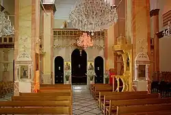 The interior of the church has three naves divided by two rows of columns. The set is richly decorated with paintings and icons.