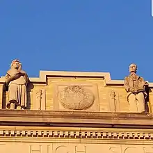 Detail of the statues and reliefs adorning the front facade of the school. Due to years of student hijinks, the heads of the statues are reinforced by metal rods.[7]