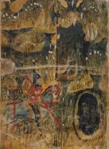 In English folklore and literature, green has traditionally been used to symbolise nature and its embodied attributes, namely those of fertility and rebirth. Critics have claimed that the Green Knight's role emphasises the environment outside of human habitation.[19] With his alternate identity as Bertilak, the Green Knight can also be seen as a compromise between both humanity and the environment as opposed to Gawain's representation of human civilisation.[20] Often, it is used to embody the supernatural or spiritual other world. In British folklore, the devil was sometimes considered to be green which may or may not play into the concept of the Green Man/ Wild Man dichotomy of the Green Knight.[21] Stories of the medieval period also portray the colour as representing love and the amorous in life,[22] and the base, natural desires of man.[23] Green is also known to have signified witchcraft, devilry and evil for its association with the fairies and spirits of early English folklore and for its association with decay and toxicity.[24] The colour, when combined with gold, is sometimes seen as representing the fading of youth.[25] In the Celtic tradition, green was avoided in clothing for its superstitious association with misfortune and death. Green can be considered in Sir Gawain and the Green Knight as signifying a transformation from good to evil and back again; displaying both the spoiling and regenerative connotations of the colour.[3][18] Given these varied and even contradictory interpretations of the colour green, its precise meaning in the poem remains ambiguous.