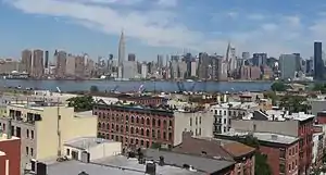 In the years that followed Greenpoint established itself as a manufacturing district.[17]:6–7[18] Its largest industries were shipbuilding, porcelain and pottery, and glassworks, but the area had other industrial concerns such as brass and iron foundries; breweries; drug plants; book, furniture, box, and boiler makers; sugar refineries; and machine shops.[19][20] Germans and Irish arrived in the mid-19th century and large numbers of Poles began arriving before the turn of the century. The homes built for the merchants and the buildings erected for their workers sprang up along streets that lead down to the waterfront. Today, this area is on the National Register of Historic Places as the Greenpoint Historic District.