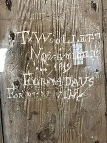 It is believed that one room of the guesthouse building, now Greyfriars Chapel, was used as a temporary prison cell in the late eighteenth century for inmates due for transportation. To this day, the names of inmates and dates of incarceration are carved into the wooden walls of the cell, including ‘T Woollett, November 1819, for 14 days for running’.
