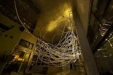 In her lighting sculptures, Amorós returns to the theme of the "Uros Islands", which are a series of floating islands in Lake Titicaca bordering Peru and Bolivia. The islands are made from dried totora reeds by the pre-Incan Uros people.[17] When Amorós first visited the islands, she was struck by "the sense of weightlessness and spiritual connectivity" she experienced by walking on them.[18]