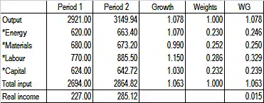 We note that the productivity model reports a 1.4% productivity growth from the same production data. The difference (1.4% versus 1.5%) is caused by the different production volume used in the models. In the productivity model the input volume is used as a production volume measure giving the growth rate 1.063. In this case productivity is defined as follows: output volume per one unit of input volume. In the growth accounting model the output volume is used as a production volume measure giving the growth rate 1.078. In this case productivity is defined as follows: input consumption per one unit of output volume. The case can be verified easily with the aid of productivity model using output as a production volume.
