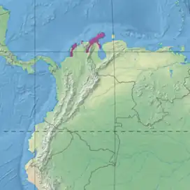The Guajira–Barranquilla xeric scrub is a xeric shrubland ecoregion in Colombia, Venezuela, and the ABC Islands (Leeward Antilles), covering an estimated area of 150,000 km2 (58,000 sq mi). Rainfall varies from 125 to 600 mm (4.9 to 23.6 in), and the median temperature is 37 °C (99 °F).[1]