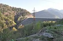 The Gura Apelor Dam is a rock-fill dam on the river Râul Mare about 35 km (22 mi) southwest of Hațeg in Hunedoara County, Romania. It is fed by the Râul Mare and its tributaries Lăpușnicul Mic and Șes.[1] It is the tallest dam in Romania. The primary purpose of the dam is hydroelectric power generation and it supports the 335 MW Râul Mare Hydroelectric Power Station which is located underground about 18 km (11 mi) to the northeast. Water from the reservoir is piped the long distance from the dam to the power station. The difference in elevation between the reservoir and the power station downstream affords a hydraulic head of 582.5 m (1,911 ft). Construction on the dam began in 1975 and the power station was operational in 1986.[2] In 2012 the dam's reservoir was drained for repairs. It is expected to be impounded again in 2014.[3]
