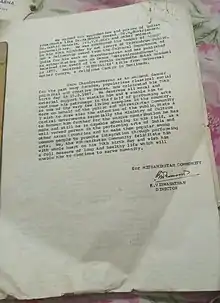 "I am delighted to witness a performance a dance drama based on National Integration presented by Pratibha Nrithakala Kendra, Trivandrum, and directed by the famous and distinguished dancer Chandrasekharan. This play describes the various periods through which we have passed from Vedic period up to the present day. It is a most thought-provoking play and one who attends this function will feel enthused and inspired and would strengthen his spirit of patriotism and love of sacrifice for his country."