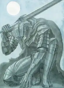 Some aspects of Guts (personality and design) were partially inspired by Miura's high school friend and later fellow manga artist Kōji Mori, by Mad Max, and by Rutger Hauer's performances in Flesh and Blood, Blade Runner, The Hitcher and The Blood of Heroes.[4][5][6][3] Guts' prosthetic hand was inspired by Dororo's Hyakkimaru and Cobra's eponymous protagonist.[7] Kurt, the protagonist of Pygmalio, by Shinji Wada, and an illustration of a giant wielding a sword, featured in The Snow Queen (a Guin Saga spin-off), inspired the size of Guts' sword, the Dragon Slayer, by mixing both characters' swords.[8][9]