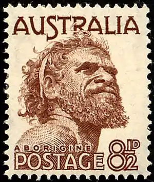 In 1950 the image was used on an 8½ pence stamp and a 2 shillings and 6 pence (half crown) stamp,[13][1] which made Tjungurrayi was the first Aboriginal person, as well as the first living Australian, to appear on an Australian postage stamp.[3] The stamp was re-released in 1952,[5] and over 99 million of the stamps were sold between 1950 an 1966.[3] However, in 2021 it was discovered that his image was reproduced on an even earlier stamp – a stamp released in 1938 to celebrate the centenary of Geelong. This stamp was only a collector's item and there was no decimal mark printed on it.[1]
