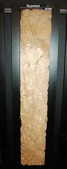 Gypsisols in the World Reference Base for Soil Resources (WRB)[1] are soils with substantial secondary accumulation of gypsum (CaSO4.2H2O). They are found in the driest parts of the arid climate zone. In the USDA soil taxonomy they are classified as Gypsids (USDA Soil Taxonomy), in the Russian soil classification they are called Desert soils (USSR).