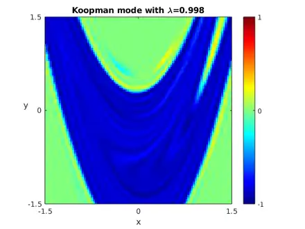 In dynamical system, the Koopman operator is a natural linear operator on the space of scalar fields. For general nonlinear systems, the eigenfunctions of this operator cannot be expressed in any nice form. Instead one must compute them numerically. These modes can give insight into the symbolic dynamics of chaotic maps like the Hénon map.[7] In the mode provided, the stable manifold of the strange attractor can be clearly seen.