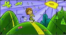The Krofft brothers have responded in several interviews to popular beliefs that subtle recreational drug references exist in the show.[22][23][24] For example, the title character's name Pufnstuf has been interpreted as a reference to smoking hand-rolled (H.R.) marijuana (puffin' stuff);[22][23][24][25][26][27] Marty Krofft has said the initials H.R. actually stand for "Royal Highness" backwards.[26][27] The show's theme song lyric "he can't do a little, 'cause he can't do enough" has been read as referring to the addictive nature of drugs. Pufnstuf has quotes like "Whoa, dude!" and other "hippie" slang words. Lennie Weinrib, the show's head writer and the voice of Pufnstuf, has said, "I think fans gave it a kind of mysterious code-like meaning, like ‘Ah, was Pufnstuf puffing stuff? Like grass?’ Was it psychedelic? Was it drug oriented? Not to us, it wasn't."[28][29] In a 2000 interview, Marty Krofft answered the question by saying, "The Krofft look has a lot of color, but there were no drug connotations in the show." He addressed the topic at length in an interview with the St. Louis Post-Dispatch in 2004, in response to the question, "OK, let's get this right out in the open. Is H. R. Pufnstuf just one giant drug reference?":
