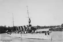 Brisbane was reactivated on 14 April 1923.[2] On 23 July 1924, she ran aground off Port Moresby, New Guinea; she was refloated later that day.[8] From February until August 1925, the ship served with the Royal Navy's China Squadron as part of an exchange, with HMS Concord sent to Australia.[5] While deployed with the China Squadron, Brisbane became the first RAN ship to visit Japan.[9] The cruiser was placed back in reserve on 7 October, underwent a refit, and recommissioned on 17 November as a training ship attached to Flinders Naval Depot.[2] A longer period of decommissioning and refit ran from 30 October 1926 until 28 June 1928, when she resumed training duties.[2] In August 1928, Brisbane visited Hawaii, and was present for celebrations commemorating the 150th anniversary of the islands' discovery.[2] The cruiser was again decommissioned, on 16 August 1929.[2]