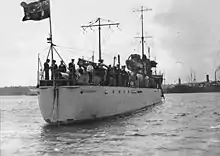 After entering Australian control, the two ships sailed to Melbourne for a gala welcome. During the celebrations, the ship's engineering officer fell overboard and drowned. On 1 March 1911, Parramatta was recommissioned as His Majesty's Australian Ship, although the HMAS prefix was not officially approved until 10 July, when King George V granted permission for the Commonwealth Naval Forces to be renamed the Royal Australian Navy.[9] On 4 October 1913, Parramatta took part in a formal fleet entry into Sydney Harbour welcoming the battlecruiser HMAS Australia.[10]