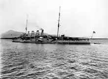 The cruiser's main armament was made up of eight single BL 6-inch Mark XI guns.[2][3] Secondary and anti-aircraft armament consisted of a single 3 inches (76 mm) quick-firing high-angle anti-aircraft gun and ten 0.303-inch machine guns (eight Lewis guns and two Maxim guns).[2] Two 21-inch torpedo tubes were fitted, with a payload of seven torpedoes carried.[2] Two hydraulic-release depth charge chutes were carried for anti-submarine warfare.[2] A single 12-pounder 8-cwt field gun and four 3-pounder Hotchkiss saluting guns rounded out the armament.[2] Armour plating consisted of side belts 3-inch (76 mm) thick amidships, tapering to 1.5-inch (38 mm) thick at the bow and stern, along with protective decking over the engineering and magazine spaces, and an armoured conning tower.[4]