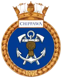HMCS Chippawa is named after a British mercantile schooner called HMS Chippawa that saw action against the Americans at the Battle of Lake Erie on 10 September 1813.[1] The ship itself was named after the Ojibwe Indigenous ethnic group (Chippewa being an anglicized adaptation) which inhabited the area near the Saulte at the west end of Lake Superior.[2]