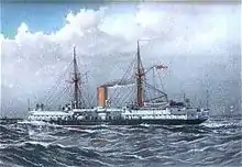 Colossus was laid down at the Portsmouth Royal Dockyard on 6 June 1879. She was launched on 21 March 1882 and was completed, apart from her armament, in 1883, allowing her to conduct sea trials later that year and into 1884.[1] These included speed tests in January 1884 and extensive shooting tests in July 1885.[4] Delays with the delivery of her guns prevented her from being completed for active service until 31 October 1886.[1] At that time, she joined the new armoured cruiser Imperieuse for a training cruise that included a stop in Vigo, Spain. During the voyage, Colossus rolled severely in bad weather and took on water through the gun ports in her turrets, while Imperieuse was not similarly affected.[5] She was then assigned to the Mediterranean Fleet, serving there until 1893. At that time, she was reduced to a coastguard ship, based in Holyhead.[1] Colossus participated in the fleet manoeuvres in August 1894, serving as part of the "Blue" fleet commanded by Rear Admiral Edward Seymour. She was assigned to Group 1 of the fleet, which also included her sister ship Edinburgh, the recently completed pre-dreadnought battleship Barfleur, and the ironclads Alexandra, Benbow, and Inflexible, and the protected cruiser St George. The exercises lasted around 36 hours before the results were decided in favour of "Blue" fleet. During the manoeuvres, Colossus was judged to have been disabled by coastal artillery at Belfast.[6]