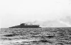 Courageous served with the Home Fleet at the start of World War II with 811 and 822 Squadrons aboard, each squadron equipped with a dozen Fairey Swordfish.[38] In the early days of the war, hunter-killer groups were formed around the fleet's aircraft carriers to find and destroy U-boats. On 31 August 1939 she went to her war station at Portland and embarked the two squadrons of Swordfish. Courageous departed Plymouth on the evening of 3 September 1939 for an anti-submarine patrol in the Western Approaches, escorted by four destroyers.[34] On the evening of 17 September 1939, she was on one such patrol off the coast of Ireland. Two of her four escorting destroyers had been sent to help a merchant ship under attack and all her aircraft had returned from patrols. U-29, commanded by Captain-Lieutenant Otto Schuhart, stalked Courageous for more than two hours. The carrier then turned into the wind to launch her aircraft. This put the ship right across the bow of the submarine, which fired three torpedoes. Two of the torpedoes struck the ship on her port side before any aircraft took off, knocking out all electrical power, and she capsized and sank in 20 minutes with the loss of 519 of her crew, including her captain.[39] The US cargo ship Collinsgworth, Ellerman Lines cargo ship Dido, and Dutch ocean liner Veendam rescued survivors. The two escorting destroyers counterattacked U-29 for four hours, but the submarine escaped.[40]
