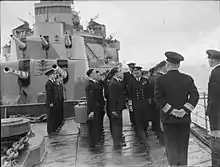 Between August and September she entered the HM Dockyard at Devonport where her aircraft facilities were removed and additional 20 mm weapons were installed in order to improve her air defences. Her radar was improved by fitting a new Fire-Control Type 283. The opportunity was also taken to install IFF equipment and VHF radio-telephone outfits.[4] Upon completion of her refit she was transferred to join the Commander-in-Chief, Plymouth. On 26 October she took to sea the First Sea Lord, Admiral Sir Andrew Cunningham to undertake the interment of the ashes of Admiral Sir Dudley Pound and his late wife in the Solent, 30 miles (48 km) off Nab Tower.[9][4]