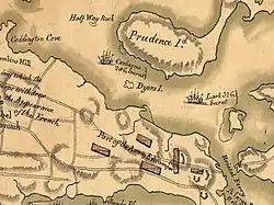 French Admiral d'Estaing's squadron arrived in Narragansett Bay on 29 July 1778 to support the American army under General George Washington during the battle of Rhode Island. On 30 July, four French ships of the line entered Narrangansett Bay and positioned themselves north of Conanicut Island to support the American and French forces in the battle of Rhode Island.[5] The arrival of the French vessels trapped several British vessels, Lark among them. On 5 August 1778, as Lark lay off Newport, Captain Richard Smith had her set on fire and her cables cut. She then drifted on to shore.[6] The Royal Navy ended up having to destroy ten of their own vessels in all.[6]