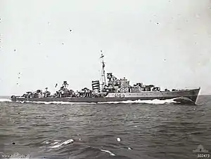 During the Battle of Sept-Îles, Rocket encountered German torpedo boats in the English Channel in October 1943, an action in which the cruiser Charybdis and destroyer Limbourne were lost. The latter was sunk by Rocket after she became disabled, to avoid her falling into enemy hands. On 29 November 1943 Rocket and HMS Tumult depth-charged and sank the German submarine U-86 east of the Azores in position 40°52′N 018°54′W / 40.867°N 18.900°W / 40.867; -18.900 (U-86).[2] Arriving in the Indian Ocean in January 1944, Rocket participated in the shelling of Sabang (25 July 1944) and of the Andaman Islands (February and March 1945).