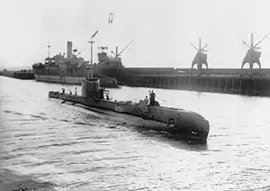 For surface running, the boats were powered by two 950-brake-horsepower (708 kW) diesel engines, each driving one propeller shaft. When submerged each propeller was driven by a 650-horsepower (485 kW) electric motor. They could reach 15 knots (28 km/h; 17 mph) on the surface and 10 knots (19 km/h; 12 mph) underwater.[3] On the surface, the third-batch boats had a range of 6,000 nautical miles (11,000 km; 6,900 mi) at 10 knots (19 km/h; 12 mph) and 120 nmi (220 km; 140 mi) at 3 knots (5.6 km/h; 3.5 mph) submerged.[2]