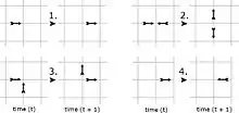 In this step, the above rules 2., 3., and 4. are checked and applied if any collisions have occurred. This results in head-on collision particles changing direction, pass-through collisions continuing unchanged, or non-colliding particles simple remaining the same.