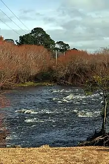 The Minister for Land and Works had approved work on raising it in 1939, but this was postponed indefinitely due to World War II.[86] Raising or renewal of the bridge was again being investigated in 1946.[87] The river again flooded over the bridge in July 1952, the first time since the mid-1940s,[88] and the timber deck was still being repaired into 1953.[89] The last and latest bridge was constructed as part of a bypass of the centre of Hadspen. By 1978, the Bass Highway crossed the river further upstream and the old main road was no longer a through road.[90] This bridge is a 240 metres (790 ft) long two-lane single-carriageway concrete structure.[91]