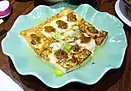 | Yong Tau Foo | ![]() | 釀豆腐 | 酿豆腐 | niàng dòufǔ | [ɲjɔŋ˥ tʰɛu˥ fu˥˧] | One of the more popular dishes with deep Hakka origins, it consists of tofu cubes heaped with minced meat (usually pork), salted fish and herbs, and then fried until it produces a golden brown colour, or it can be braised. Variations include usage of various oddments, including eggplants, shiitake mushrooms, and bitter melon stuffed with the same meat paste. Traditionally, ngiong tew foo is served in a clear yellow bean stew along with the bitter melon and shiitake variants. Modern variations that are more commonly seen sold in food stalls are made by stuffing the tofu with solely fish paste. Usage of oddments to replace the tofu are more noticeable in this version, ranging from fried fish maw slices and okra to chili peppers. |