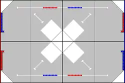 The teams were put into two-team alliances, with two alliances competing against each other in each match, one being the red alliance, and the other the blue alliance. During the autonomous period, teams' robots competed for 45 seconds without operator control, relying only upon sensor input and programming to score points. The 8' x 12' competition field consisted of a wooden ramp at either end of the field, forming a rough half-pipe shape. The team members stood at either end of the field. The main playing elements were blue and red racquetballs. On the foam field floor, two lines of blue and two lines of red racquetballs were arranged. Mounted on the walls closest to the teams' operators were four ball dispensers, each with 15 balls. Dispensers with like-colored balls were placed on opposite sides of the field, as were the lines of balls. Corner goals were placed at the corners of the field, with three-inch walls to hold racquetballs. In the operator control period, a triangular high goal was present at the center of the field. From the three sides, thin eighteen-inch square platforms extended. In the autonomous period, there were four platforms and the center goal was square and divided into quadrants, with the walls at 45° angles to the field's walls. Also, the field was divided by wooden walls into quadrants. White lines of tape were placed on the field for the autonomous period to allow for strategic line following by the robots.