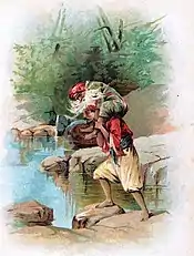 Sinbad the Sailor encountered the monstrous Old Man of the Sea (Arabic: شيخ البحر, romanized: Shaykh al-Bahr) on his fifth voyage. The Old Man of the Sea in the Sinbad tales was said to trick a traveller into letting him ride on his shoulders while the traveller transported him across a stream. However, the Old Man would then not release his grip, forcing his victim to transport him wherever he pleased and allowing his victim little rest. The Old Man's victims all eventually died of this miserable treatment, with the Old Man either eating them or else robbing them. Sinbad, however, after getting the Old Man drunk with wine, was able to shake him off and kill him.[2]