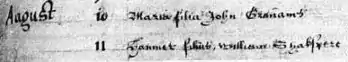 Little is known about Hamnet.[4] Hamnet and his twin sister Judith were born in Stratford-upon-Avon and baptised on 2 February 1585 in Holy Trinity Church by Richard Barton of Coventry.[2] The twins were probably named after Hamnet Sadler, a baker, who witnessed Shakespeare's will, and his wife, Judith;[1] Hamnet was not an uncommon personal name in medieval and early modern England.[6] According to the record of his baptism in the Register of Solihull, he was christened "Hamlette Sadler".[7][8]