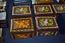 Another important product is lacquerware, part of a larger Mesoamerican craft tradition. Most is produced in Olinalá, but there are also production in nearly Acapetlahuaya and Temalscacingo.[4] Lacquer work dates back to the pre Hispanic period, when it was used to preserve and decorate wood objects, gourds and more. It survives mostly intact, with changes only in decorative motifs through the colonial period to modern times. Until recently, most wood items were made from a fragrant species called linaloe, but over exploitation has made it scarce and expensive.[4]