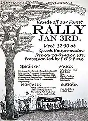• 3 January 2011. 3000 people attend a HOOF rally at Speech House Meadow, including a procession through the Cyril Hart Arboretum led by the Forest of Dean Brass Band.[52] Speeches are heard from Jonathon Porritt, Baroness Jan Royall, The Bishop of Guildford and others.